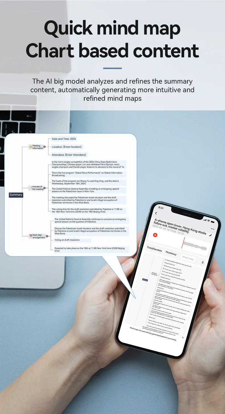 * Quick mind map: The AI large model analyzes and refines according to the summary content, and automatically generates a more intuitive and detailed mind map.