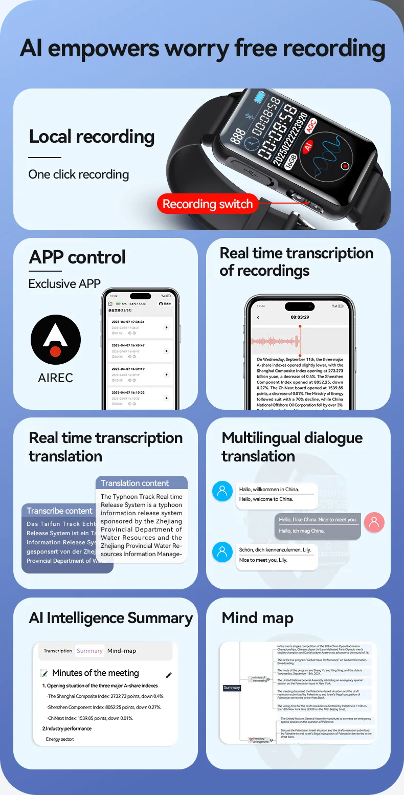 * AI Transcription Translation Dialogue: The smart recording bracelet supports real-time recording transcription into text, eliminating manual typing and improving efficiency. Supports intelligent summary and quick summary. It also supports real-time translation, multi-language dialogue translation, and supports up to 255 languages for barrier-free communication.